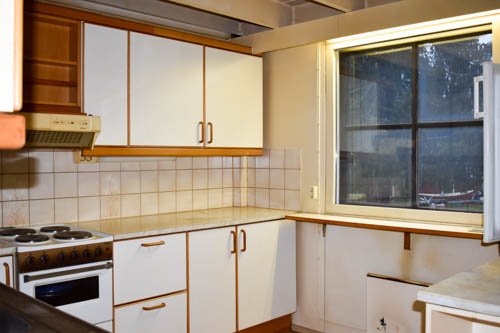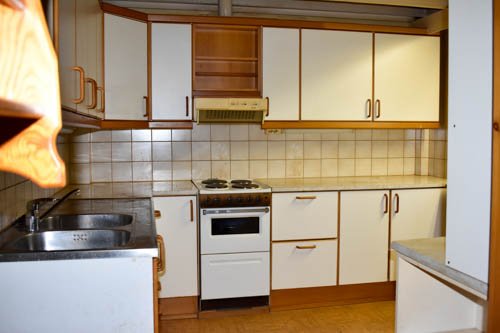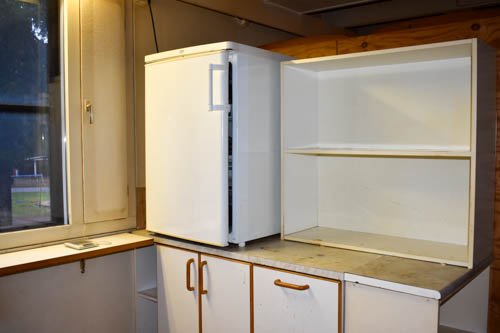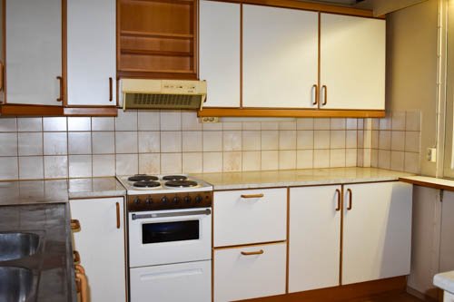 - Vaaleat kaapistot, sähköliesi ja jääkaappi. Kodinkoneiden toimivuudesta ei ole varmuutta.