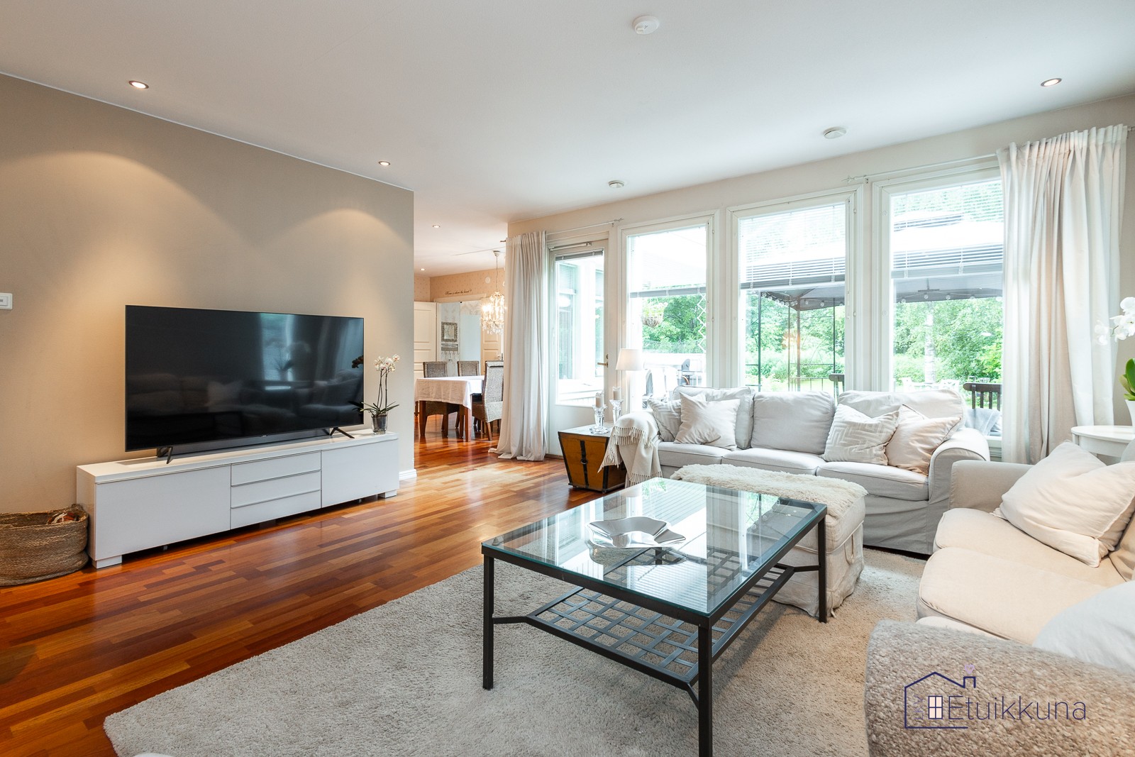 - Suuri ja viihtyisä olohuone suuntaa kauniille sekä vehreälle pihalle. Olohuoneen sisustat suurellakin sohvaryhmällä tv-tasoineen ja tilaa jää silti runsaasti väljään liikkumiseen. Kodin talvi-iltoihin tuo lämpöä ja tunnelmaa kaunis kaakelitakka, jonka nuohous on hoidettu vuosittain. Olohuoneesta on käynti kodin erityisen ihastuttavalle terassille sekä kesäiselle ruokaryhmälle.