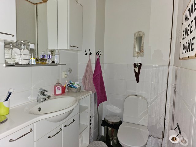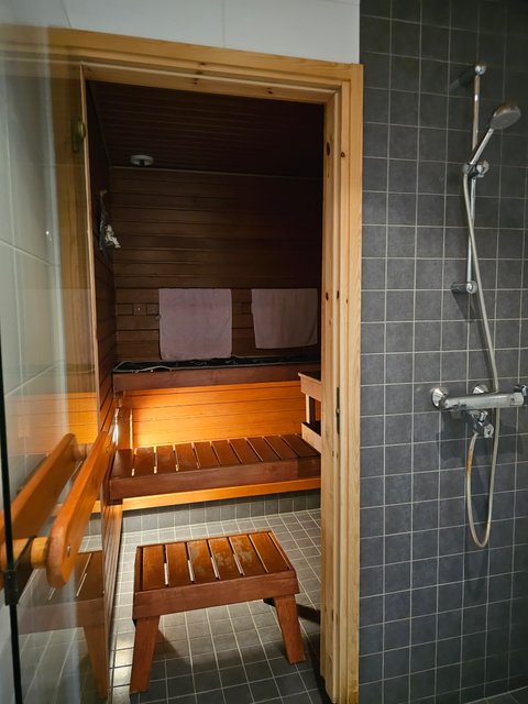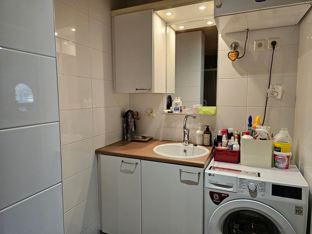 - Suihku, suihkuseinä, pesukoneliitäntä, lattialämmitys, peilikaappi, pesuallas, ja allaskaappi