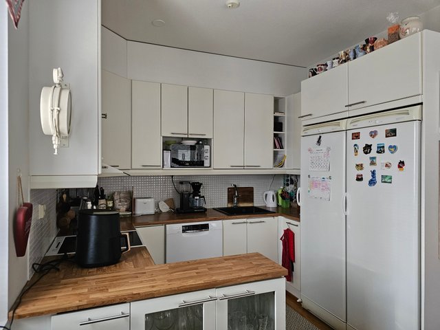 - Jääkaappi, erillinen pakastin, uuni, liesi, liesituuletin, astianpesukone, ja vitriinikaappi