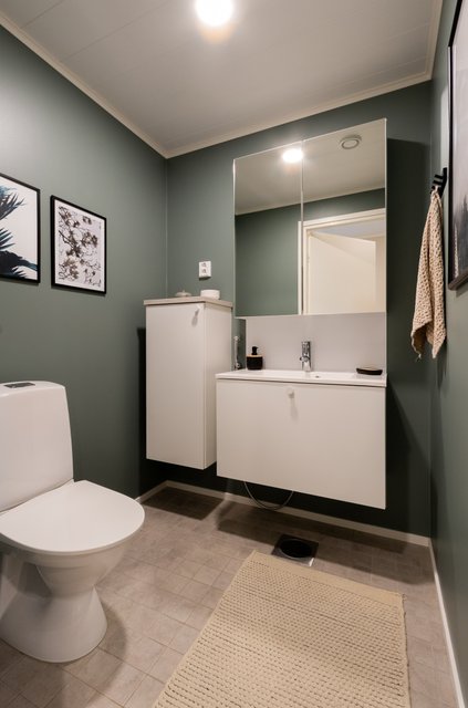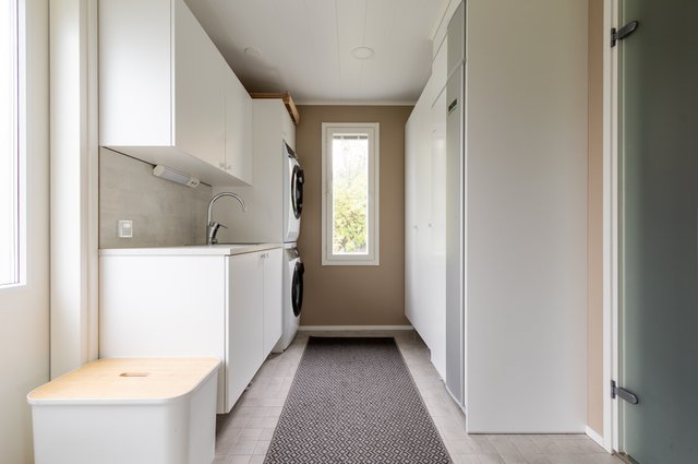 - Tila pesutornille, pesukoneliitäntä, lattialämmitys, pesuallas, lattiakaivo, pyykkikaapit, pöytätaso, ja pakastin
