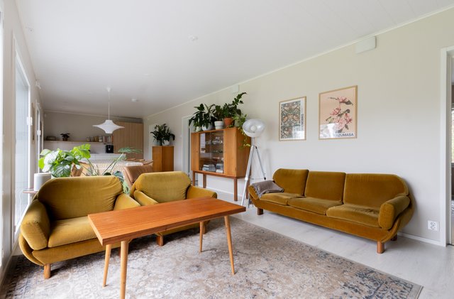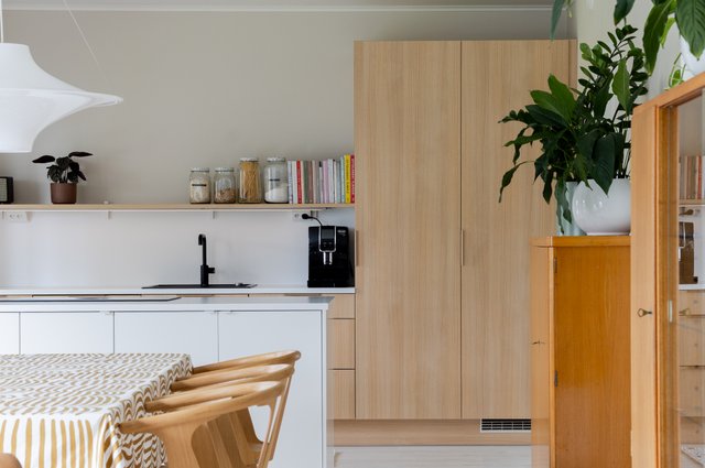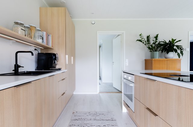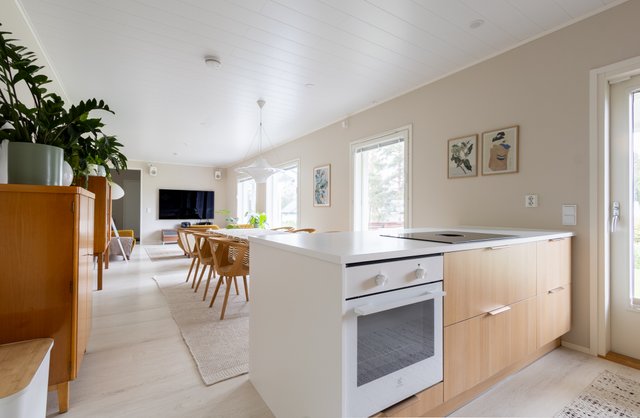 Kodin sydämen muodostaa olohuoneen, ruokailutilan ja avokeittiön avara kokonaisuus. Suuret ikkunat tulvivat tilaan luonnonvaloa, ja harmoniset sävyt luovat rauhallisen, kotoisan tunnelman. Tyylikkäässä keittiössä on saareke ja integroidut kodinkoneet. Keittiöstä on kulku terassille, jota voi halutessaan laajentaa.