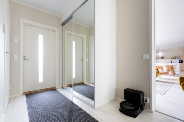 - Ruokailutila avoin olohuoneen ja keittiön välillä. Eteisessä liukuovikaapistot peileillä sekä kulku vaatehuoneeseen.