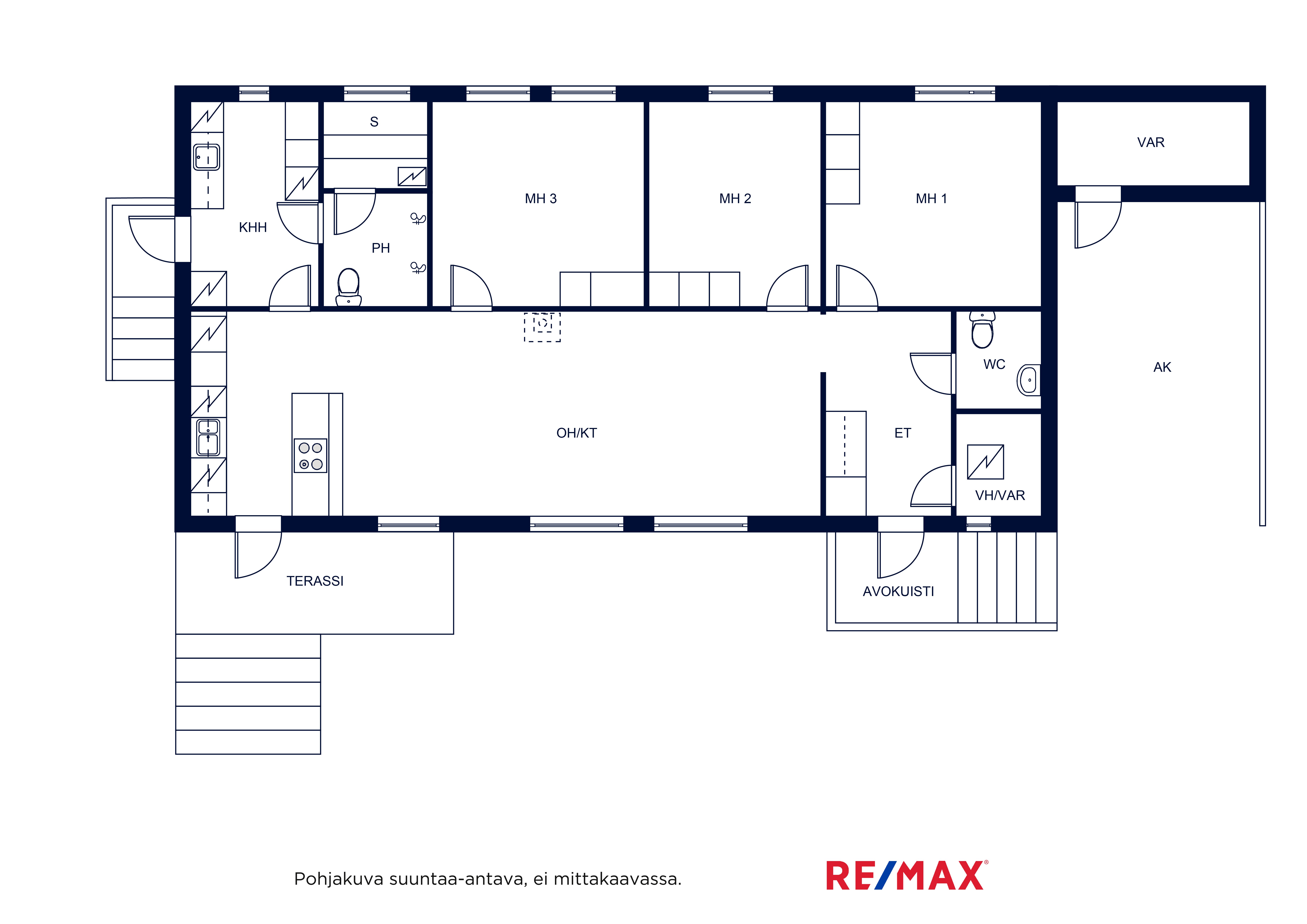 - Avokeittiö saarekkeella ja integroiduilla kodinkoneilla. Kulku terassille.